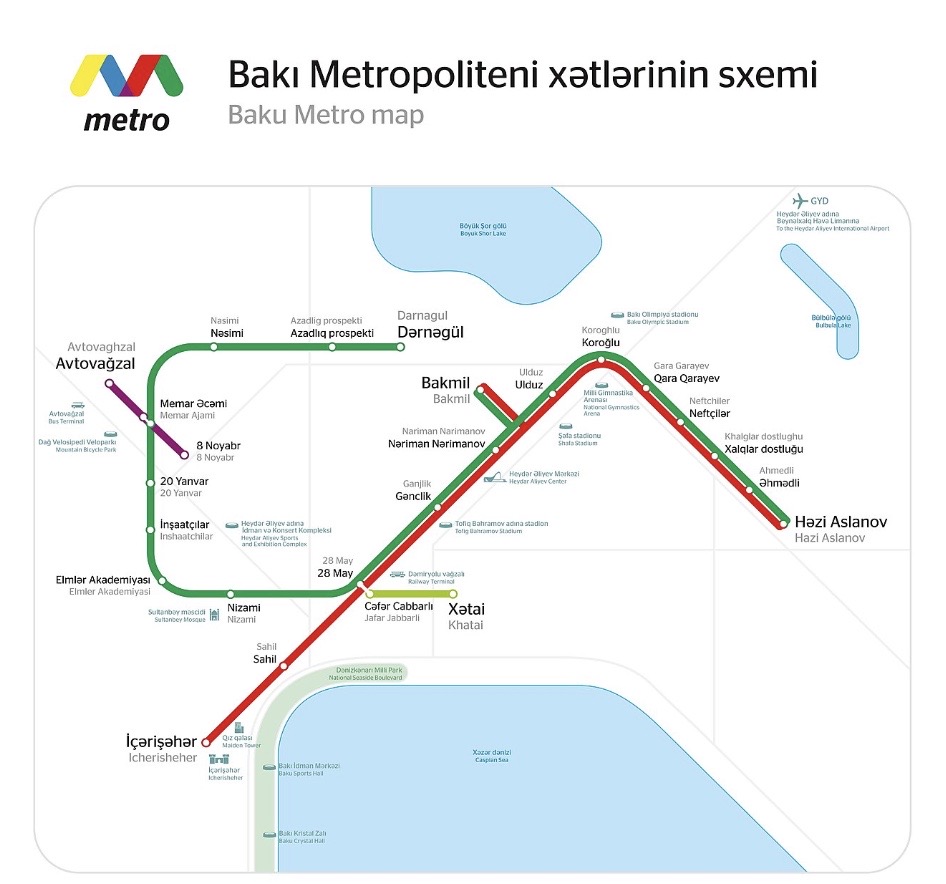 Baku, es la única ciudad de Azerbaijan que tiene servicio de metro. Existen dos lineas, la linea roja y la linea verde. Algo para destacar es que las instalaciones fueron construidas por los soviéticos y todas mantienen esta estética, casi todas las estaciones son subterráneas excepto la estación Bakmil. El servicio de metro trabaja entre las 6:00 y las 00hs, tiene una tarifa fija (0,40AZN) independientemente de la distancia del viaje y solo se puede pagar con la BakiKart, aunque quieras solo hacer un viaje tendrás que adquirir una de las tarjetas en las maquinas que puedes encontrar en todas las estaciones.